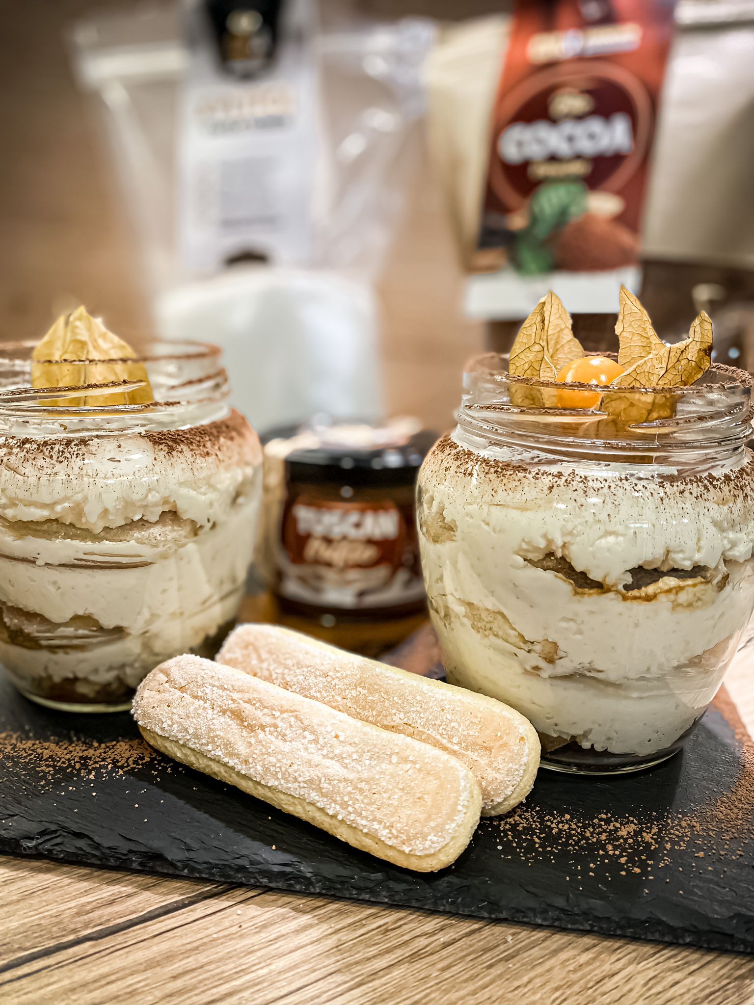 Dlouhé piškoty překrojíme na polovinu aby se nám vešly do skleniček, následně si uvaříme kávu a piškoty polijeme, aby byly vláčné. Potom přidáme tvaroh s vajičkem a xylitolem. Poskládáme si vrstvy piškoty - tvaroh, piškoty a opět polijeme kávou, a pokračujeme v tomto systému dokud nemáme naplněnou skleničku.